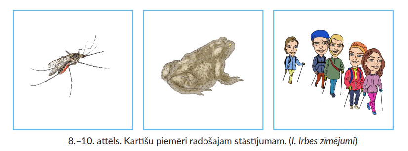 domāšanu un iztēli, jautājot: Kas te notiek? Ko tēli dara (domā, vēlas, saka)? Pēc tam skolotājs piedāvā samainīt kartītes, lai veidotos cits stāsts, piemēram, “Kā ceļotāji satika krupīti”, “Krupis ēd odus”, “Vai ceļotāji nebaidās no odiem?” u. c.