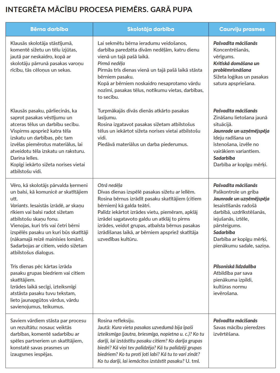 Garā pupa, mācību procesa piemērs