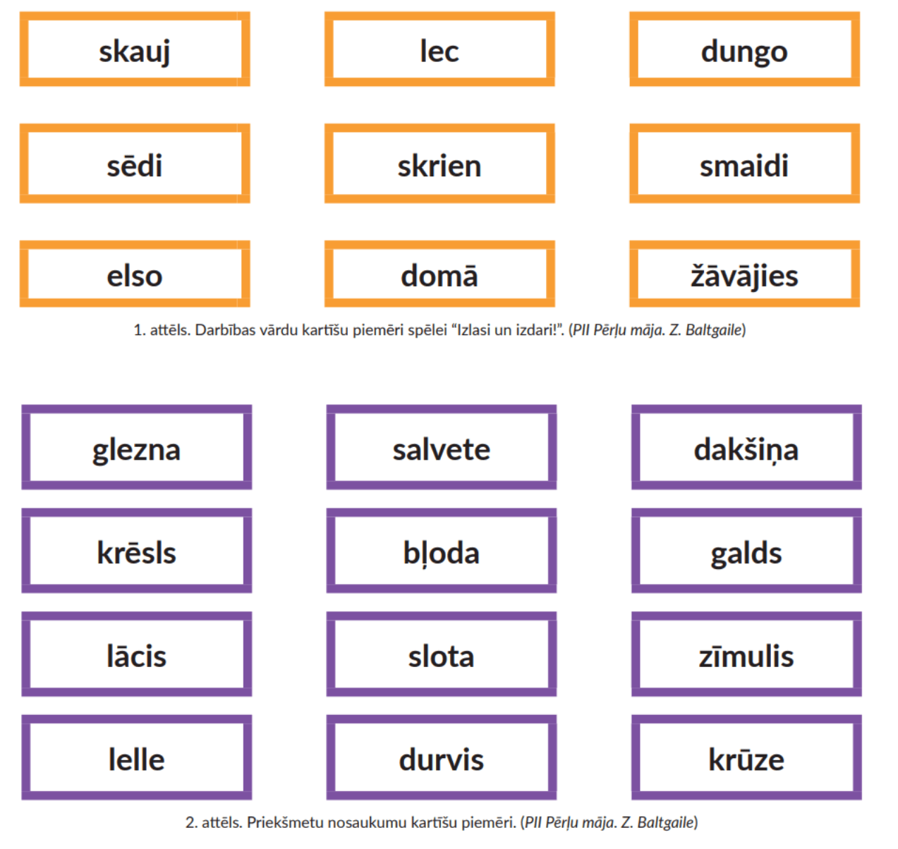 Bērns izlozē kartīti ar priekšmeta nosaukumu (sk. 2. att.). Izlasa, kas tajā rakstīts, un novieto kartīti blakus atbilstošajam