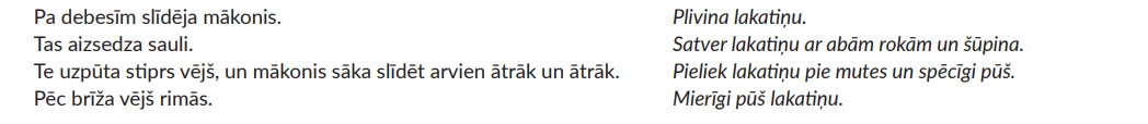 Skolotājs iedod katram bērnam zilu tilla lakatiņu. Bērni klausās skolotāja stāstījumu par mākoni un vēju un veic atbilstošās