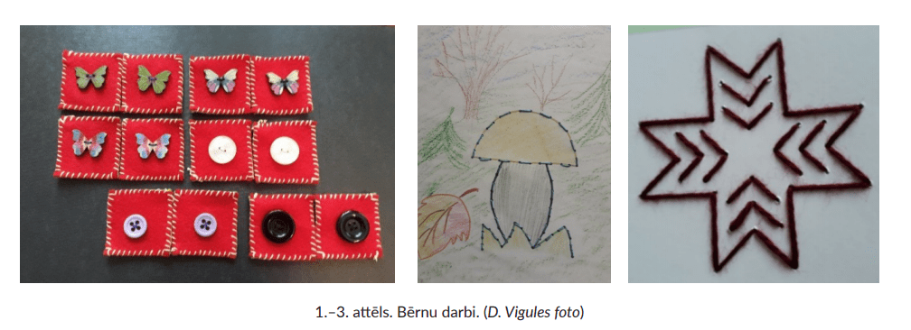Bērns izvēlas materiālus šūšanai – dažādu krāsu, faktūru un biezuma auduma gabaliņus, dažādu krāsu un rupjuma dziju, īrisa vai mulinē diegus, dažādas pogas. Nogriež vajadzīgā garuma diegu, iever adatā, uzsien mezglu. Var sašūt kopā divus auduma gabaliņus ar pamatdūrienu vai izšūt uzzīmētu rakstu, kā arī pa iepriekš izdurtiem caurumiņiem uz krāsaina kartona izšūt zīmējumu.